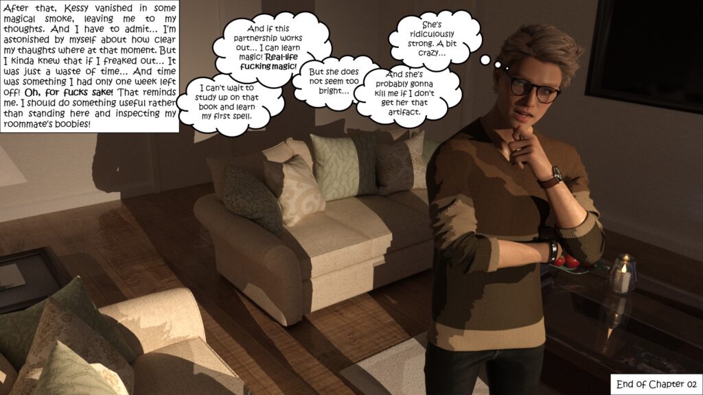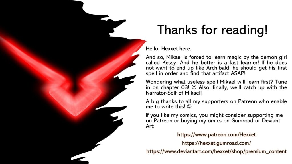 End of Chapter 02! Thanks for reading. I hope you find my story interesting. In the next chapter, we will finally catch up with narrator Mikael in time and from then on, the hunt for the mysterious artifact will begin! Also, what spell will Mikael learn first? 🙂