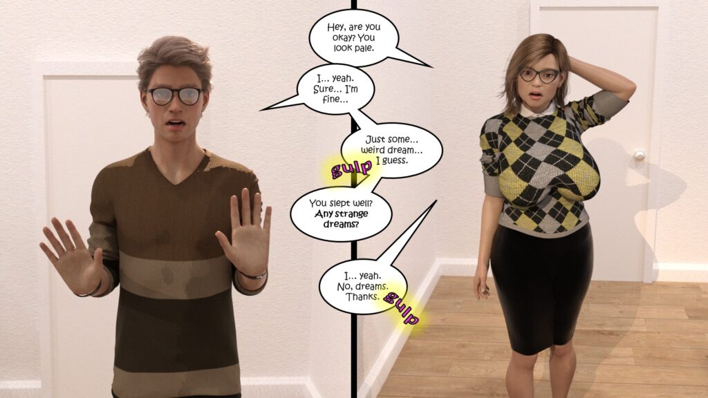 Just as he is about to walk out the door he meets Barbara who’s heading out of her room as well. Awkward!